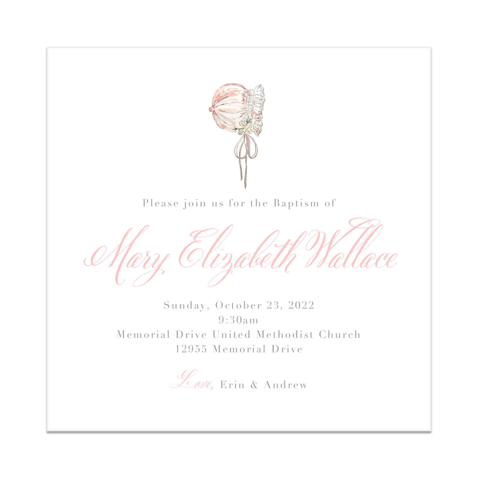 from $32.00Watercolor Bonnet Baptism Invitation